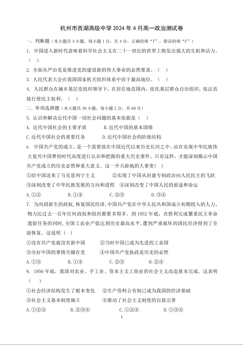 浙江省杭州市西湖高级中学2023-2024学年高一下学期4月期中考试政治