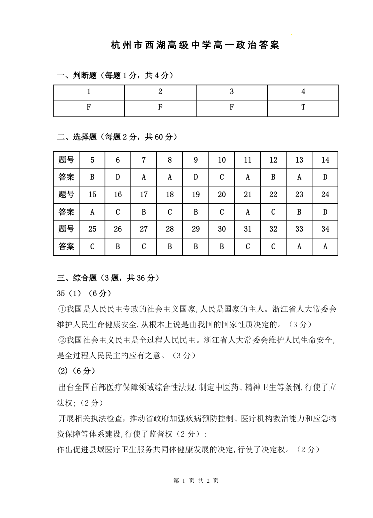 浙江省杭州市西湖高级中学2023-2024学年高一下学期4月期中考试政治答案