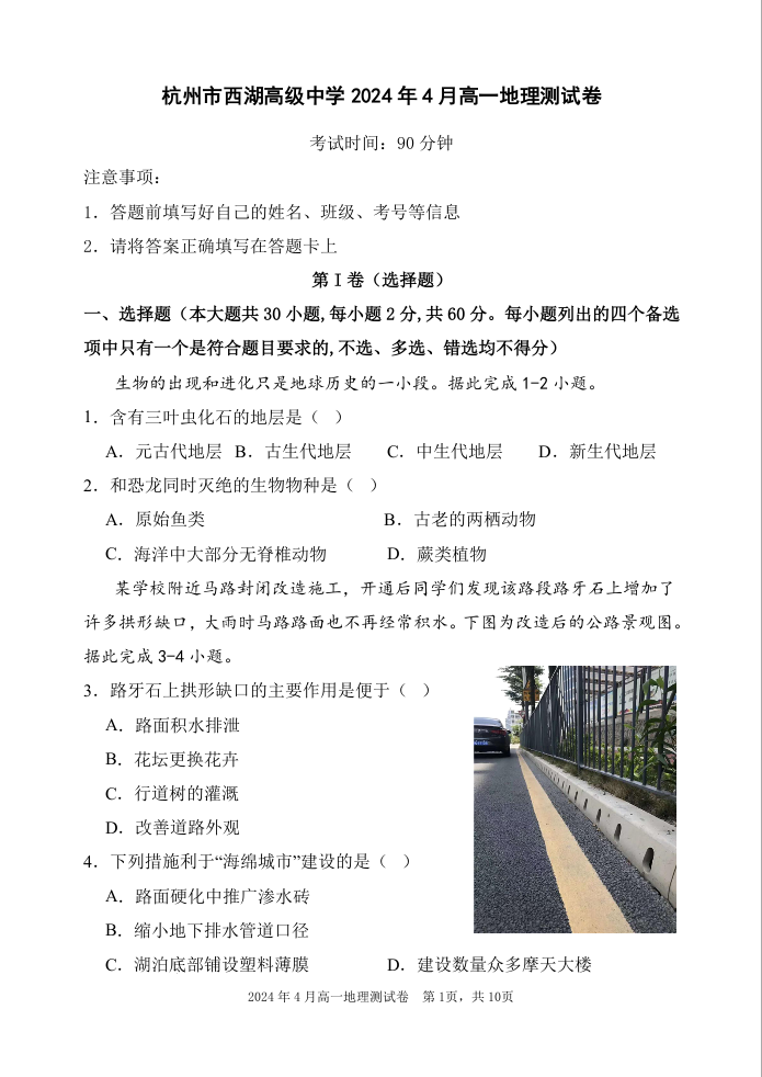 浙江省杭州市西湖高级中学2023-2024学年高一下学期4月期中考试地理