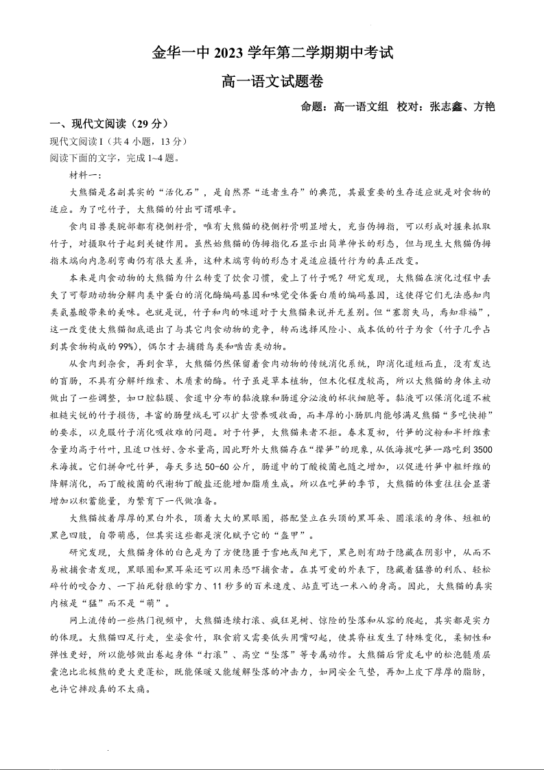 浙江省金华市第一中学2023-2024学年高一下学期4月期中考试语文