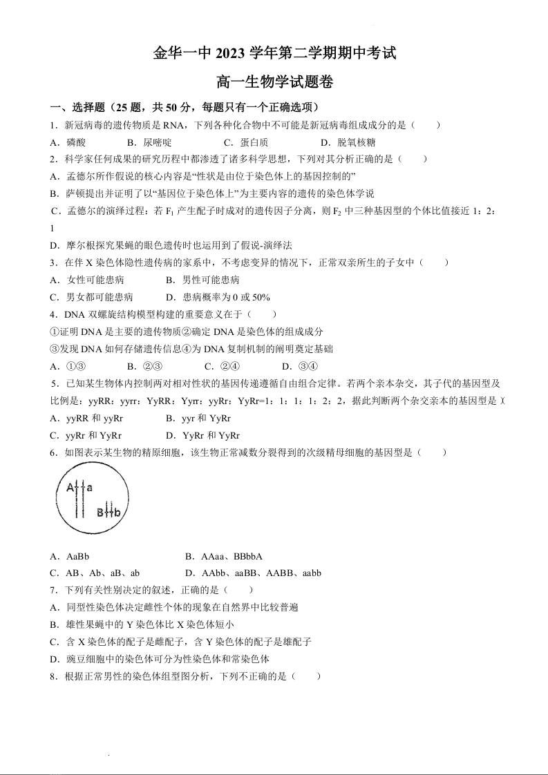 浙江省金华市第一中学2023-2024学年高一下学期4月期中考试生物