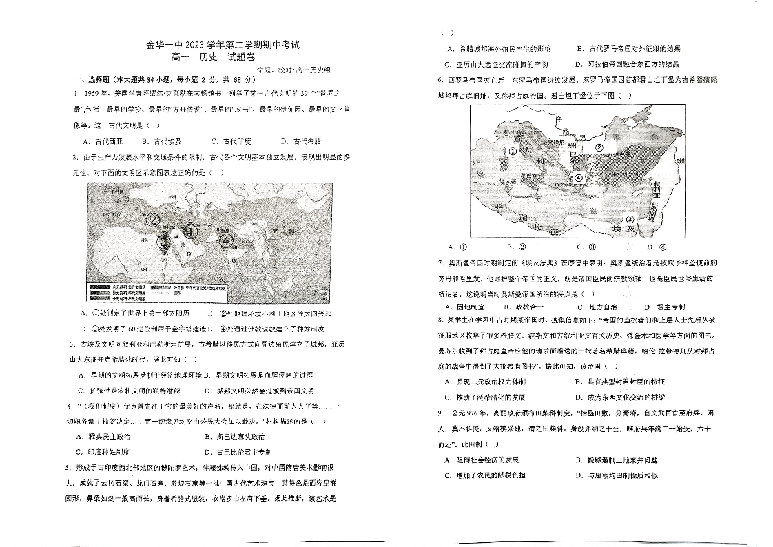 浙江省金华市第一中学2023-2024学年高一下学期4月期中考试历史