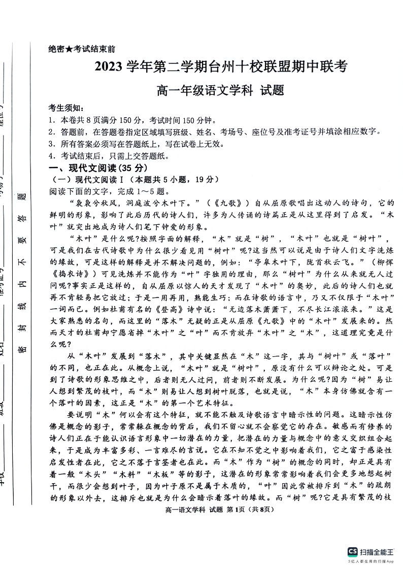 浙江省台州市十校联盟2023-2024学年高一下学期期中联考语文试题