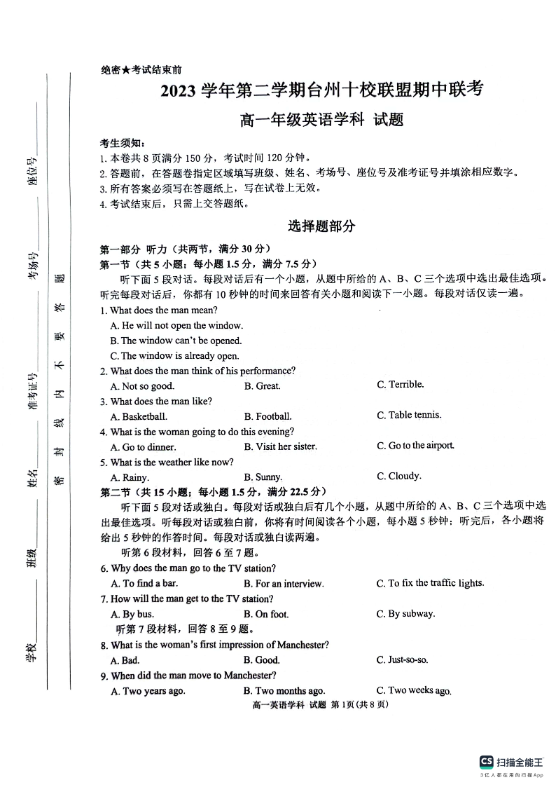 浙江省台州市十校联盟2023-2024学年高一下学期期中联考英语