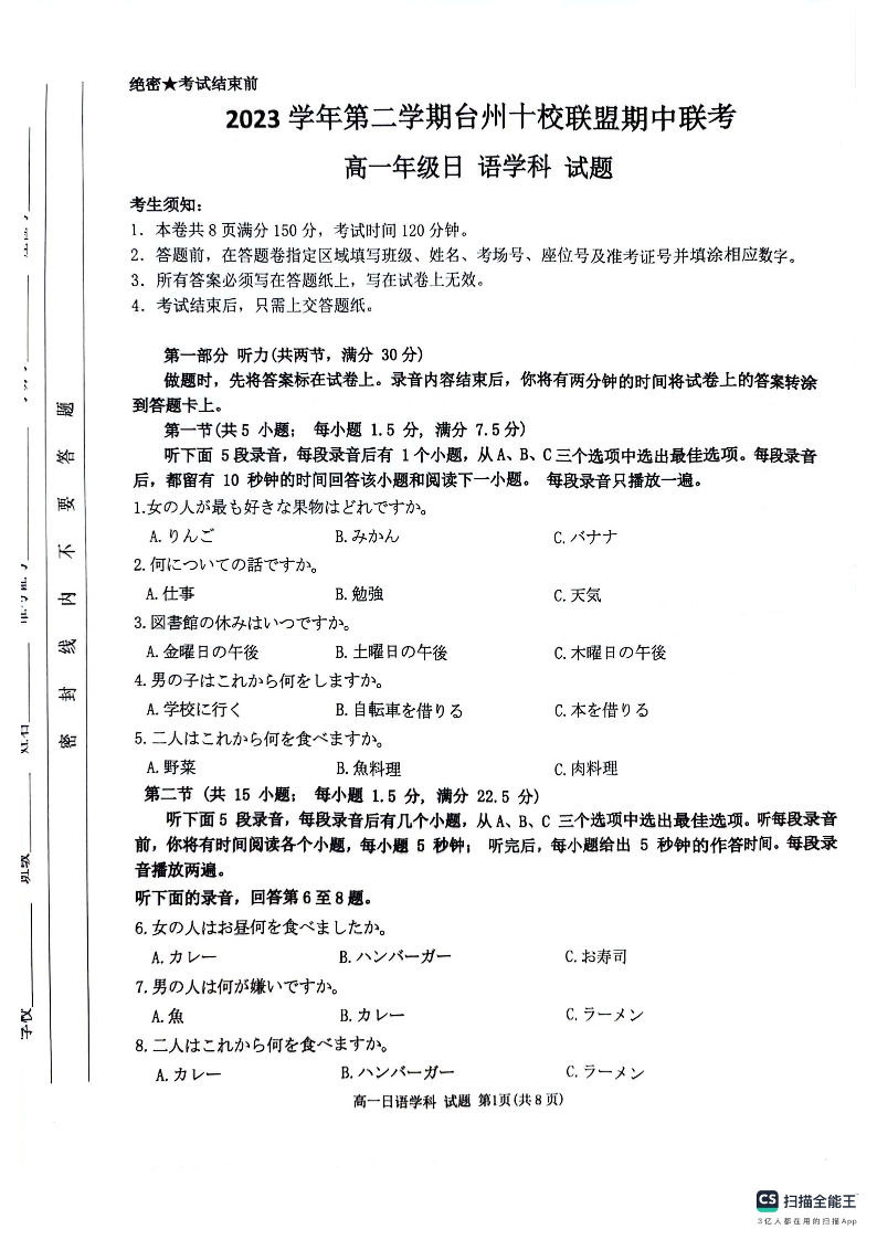浙江省台州市十校联盟2023-2024学年高一下学期期中联考日语