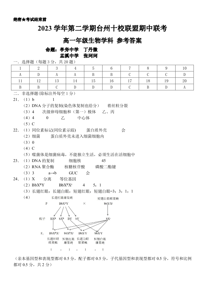 浙江省台州市十校联盟2023-2024学年高一下学期期中联考生物答案