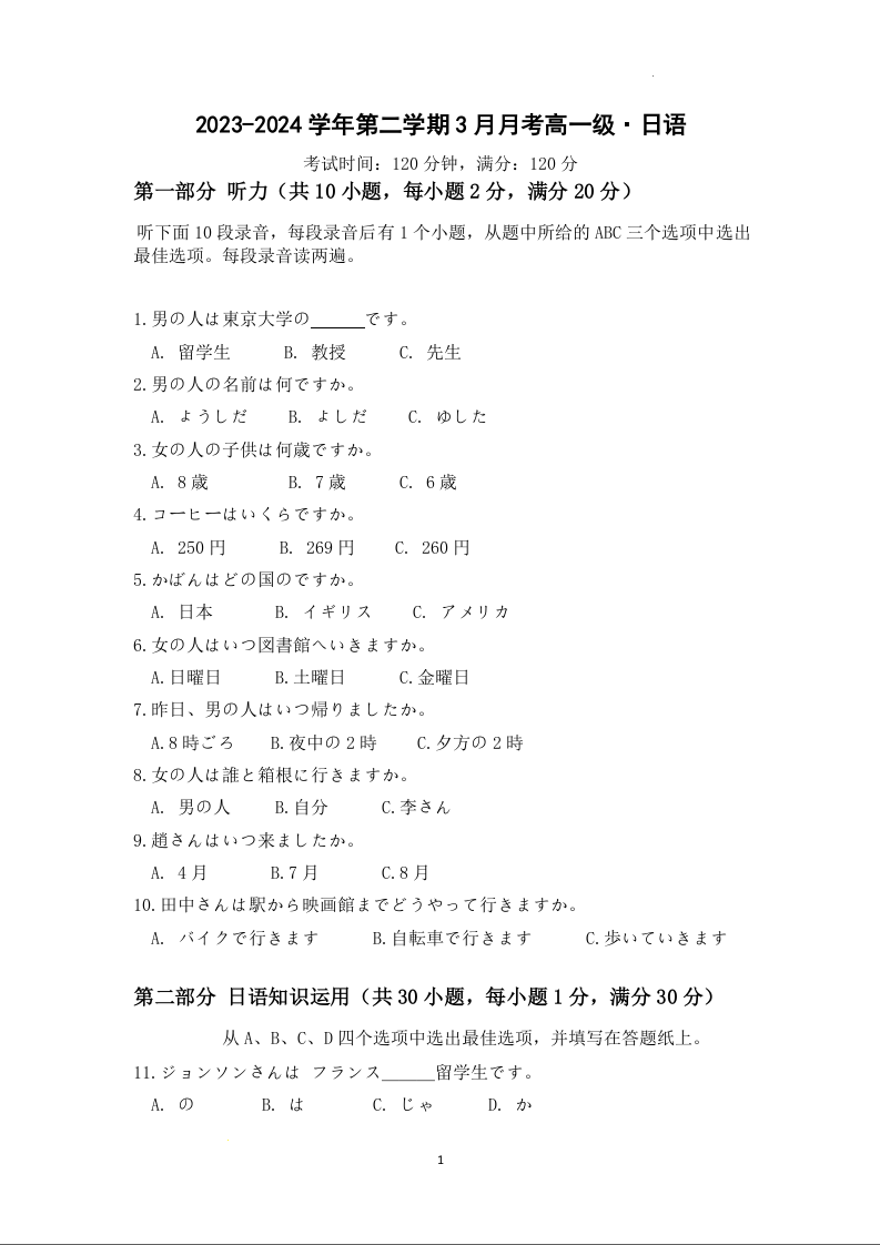 广东省湛江市第二十一中学2023-2024学年高一下学期第一次月考日语
