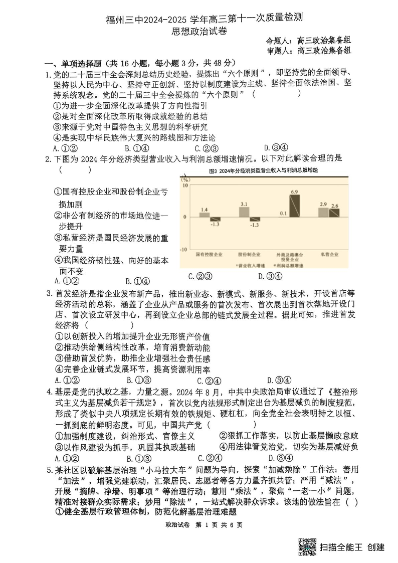 福建省福州三中2025届第二学期高三第十一次质量检测政治