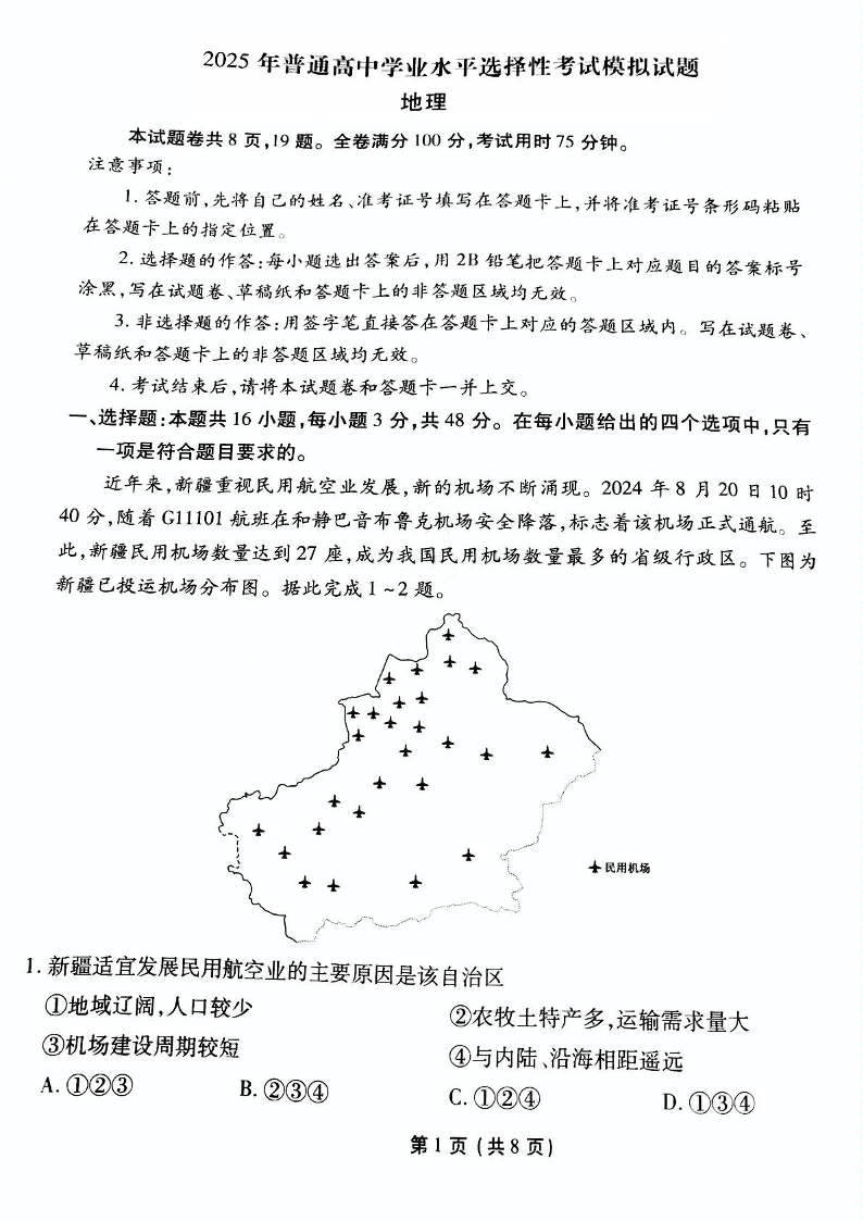 衡水金卷先享调研2025年普通高等学校招生全国统一考试模拟试题(一)地理