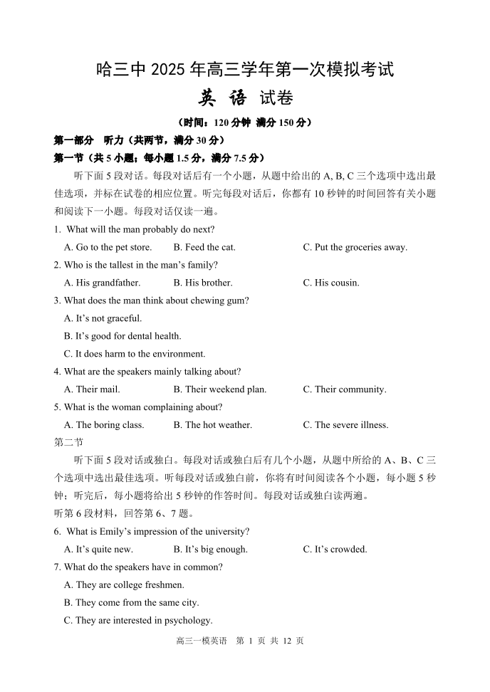 黑龙江省哈尔滨市第三中学2025届高三下学期一模考试英语