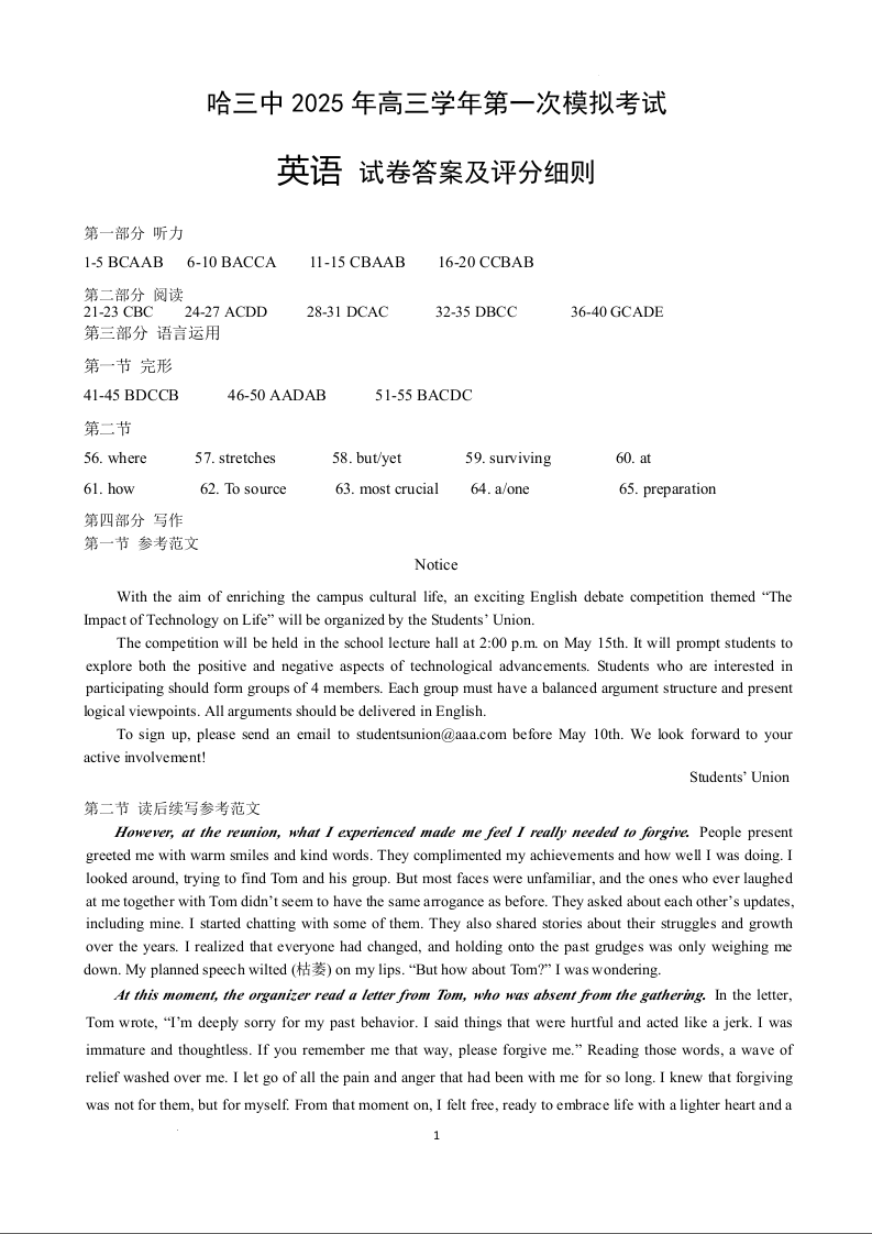 黑龙江省哈尔滨市第三中学2025届高三下学期一模考试英语答案