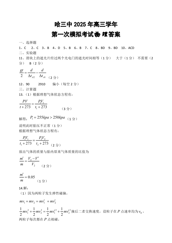 黑龙江省哈尔滨市第三中学2025届高三下学期一模考试物理答案