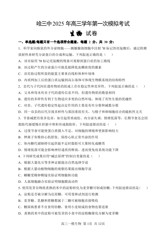 黑龙江省哈尔滨市第三中学2025届高三下学期一模考试生物