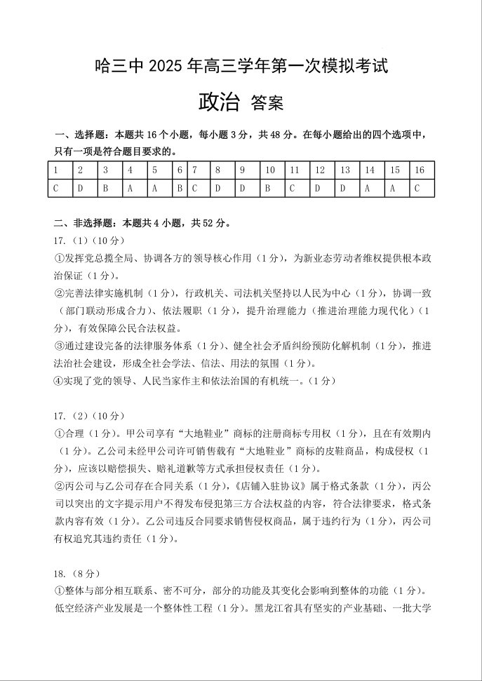 黑龙江省哈尔滨市第三中学2025届高三下学期一模考试政治答案