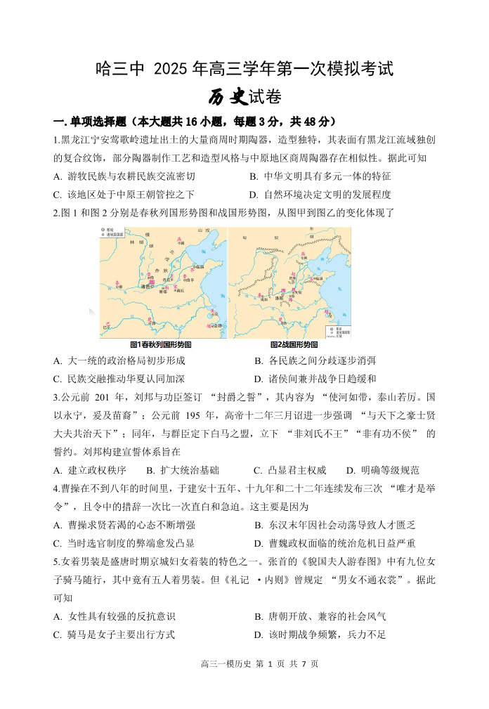 黑龙江省哈尔滨市第三中学2025届高三下学期一模考试历史