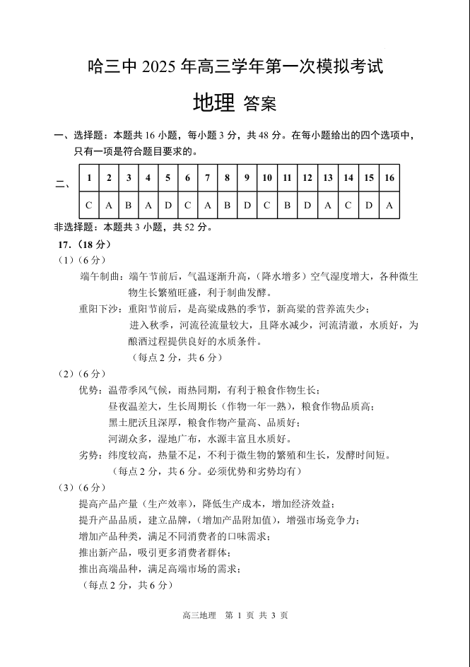 黑龙江省哈尔滨市第三中学2025届高三下学期一模考试地理答案