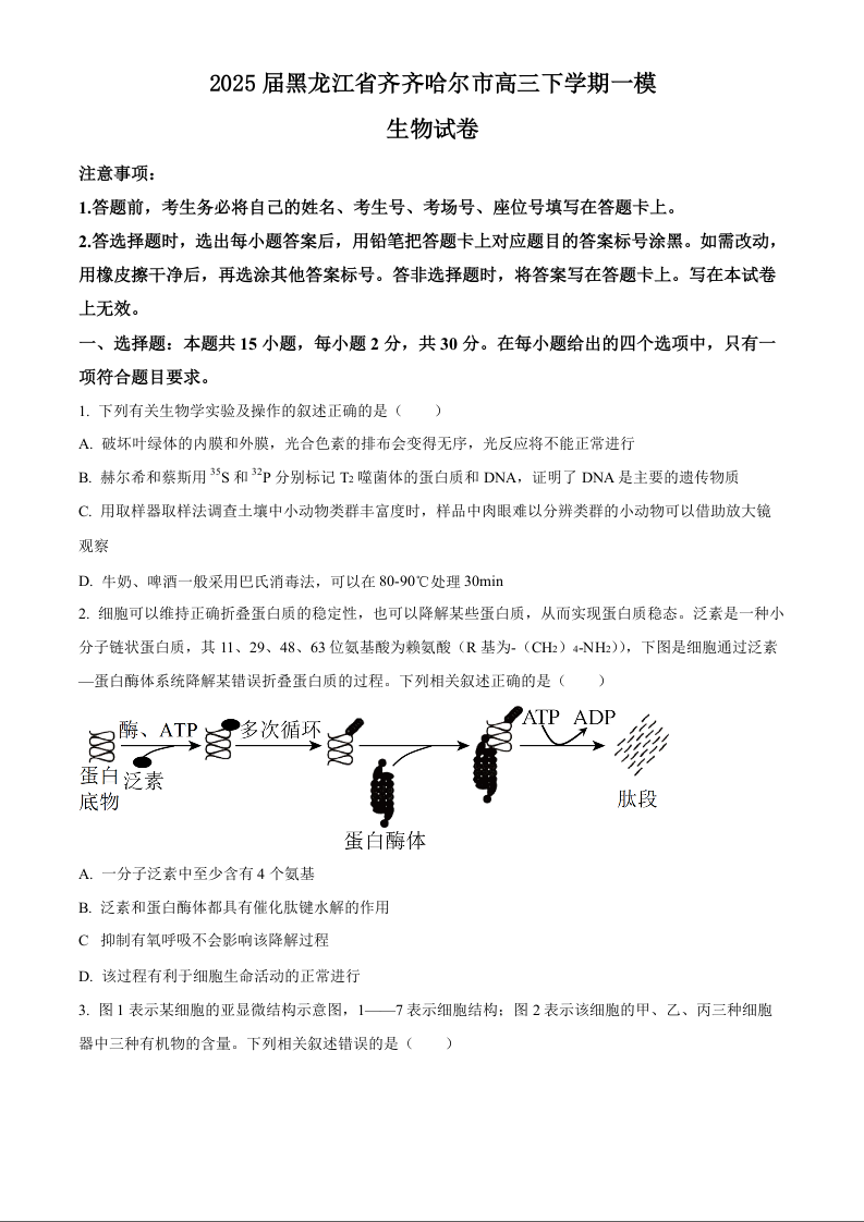 黑龙江省齐齐哈尔市2025届高三下学期一模生物+答案