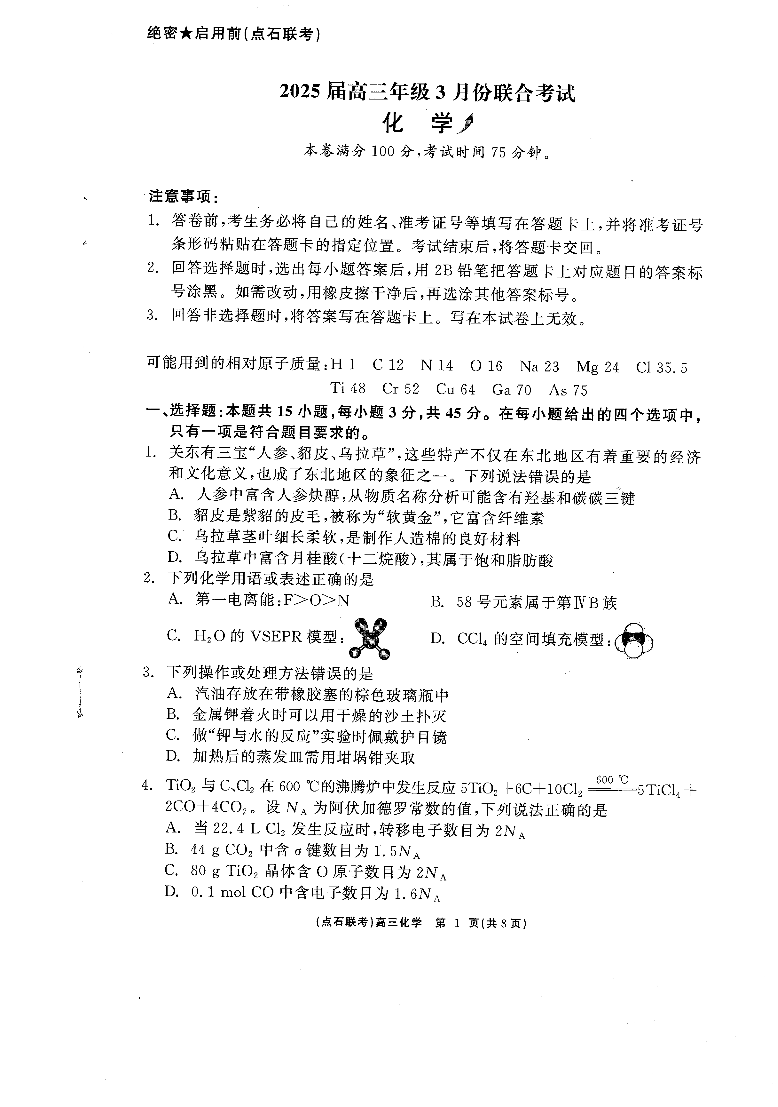 辽宁省点石联考2025届高三下学期3月联合考试化学