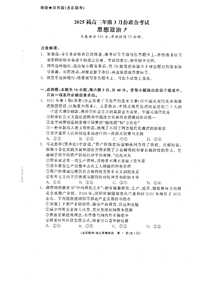 辽宁省点石联考2025届高三下学期3月联合考试政治