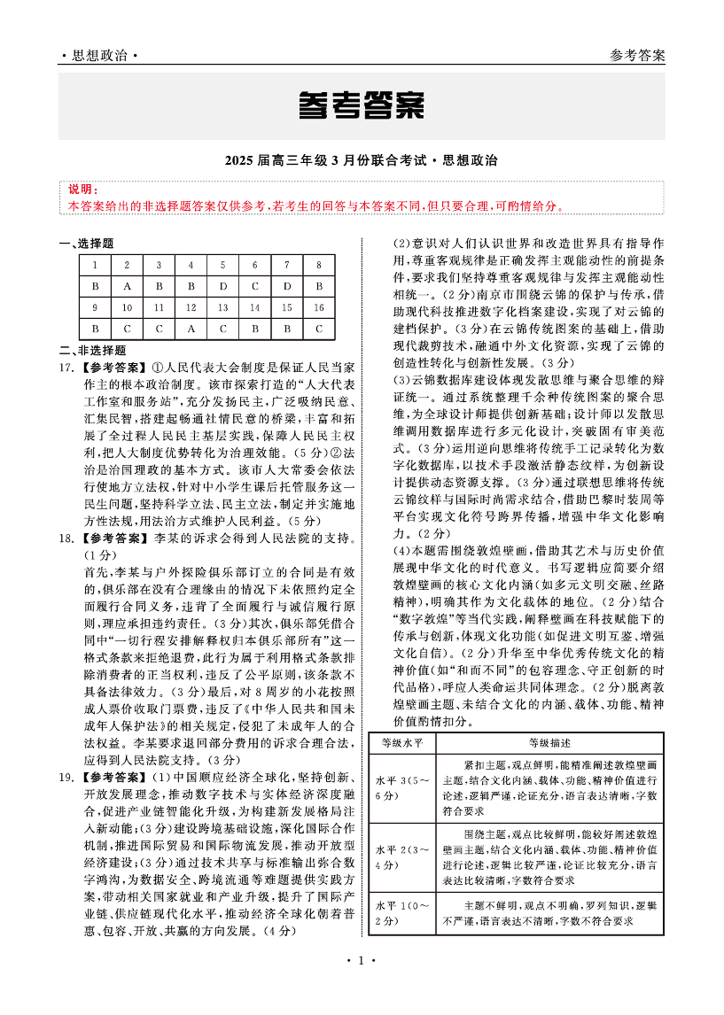 辽宁省点石联考2025届高三下学期3月联合考试政治答案