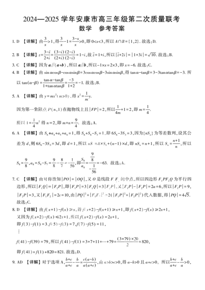 陕西省安康市2025届高三下学期第二次质量联考(安康二模)数学答案