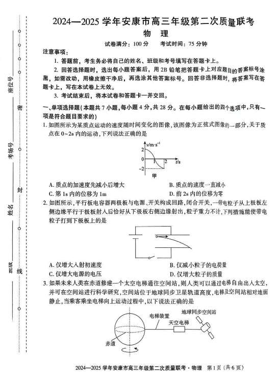 陕西省安康市2025届高三下学期第二次质量联考(安康二模)物理+答案