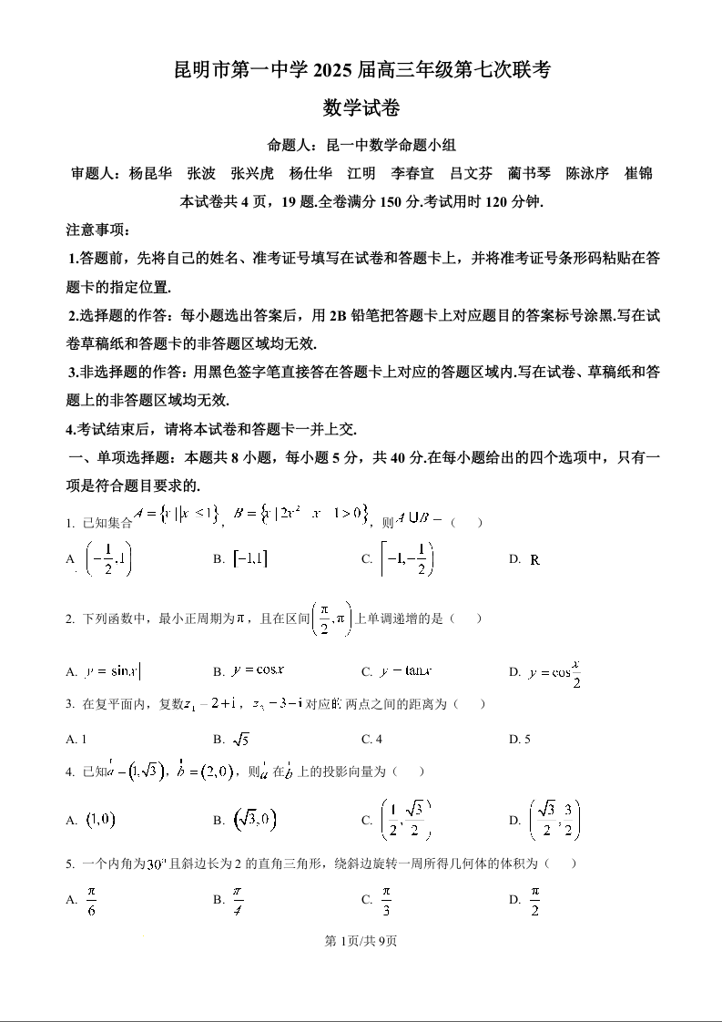 云南省昆明市第一中学2024-2025学年下学期高三第七次联考(一模)数学+答案
