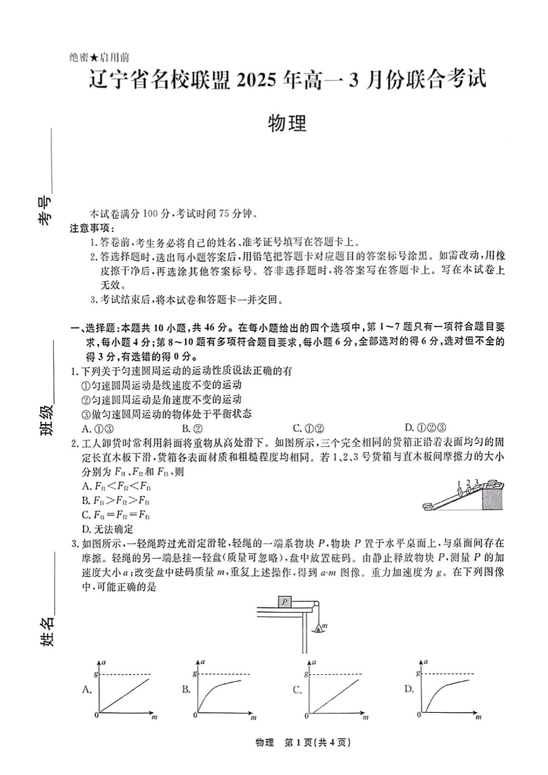 辽宁省名校联盟2024-2025学年下学期3月高一联考物理+答案