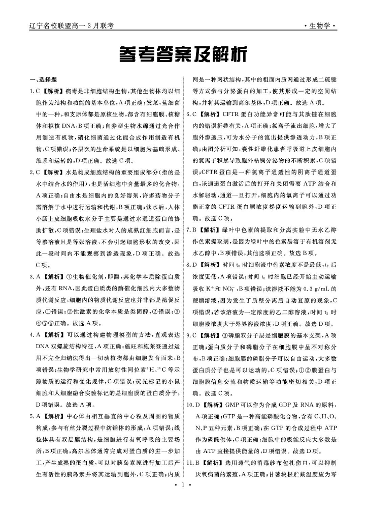 辽宁省名校联盟2024-2025学年下学期3月高一联考生物答案