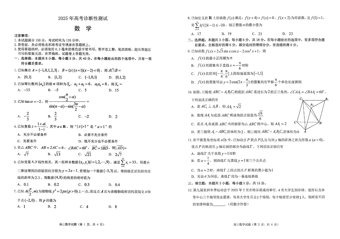 山东省烟台市2024-2025学年下学期3月高三诊断性测试(一模)数学