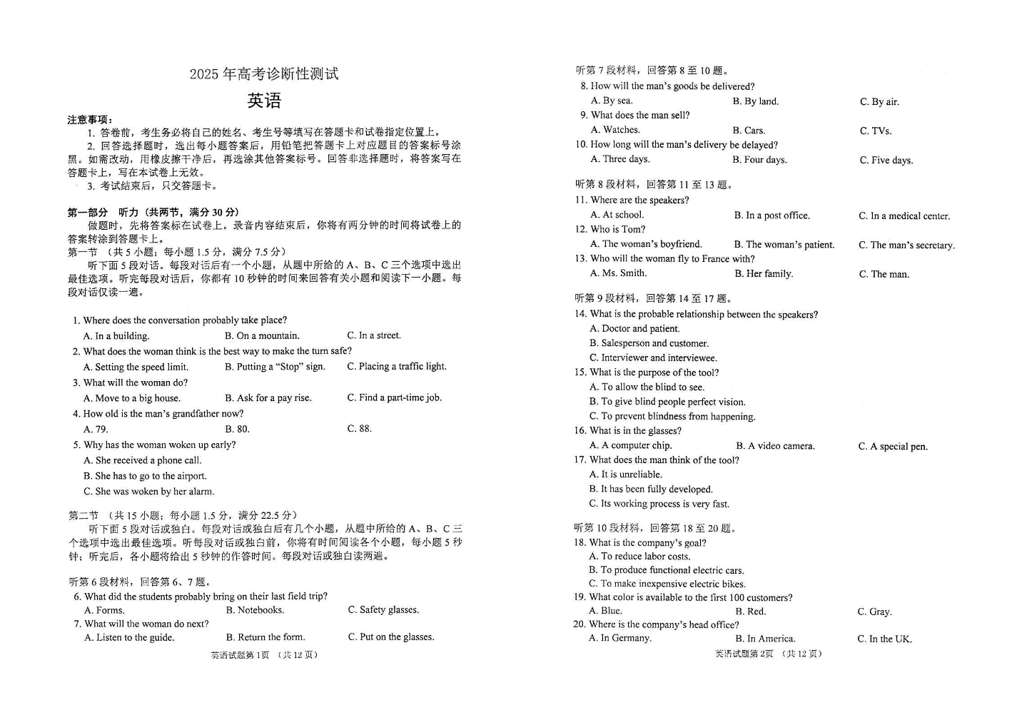 山东省烟台市2024-2025学年下学期3月高三诊断性测试(一模)英语