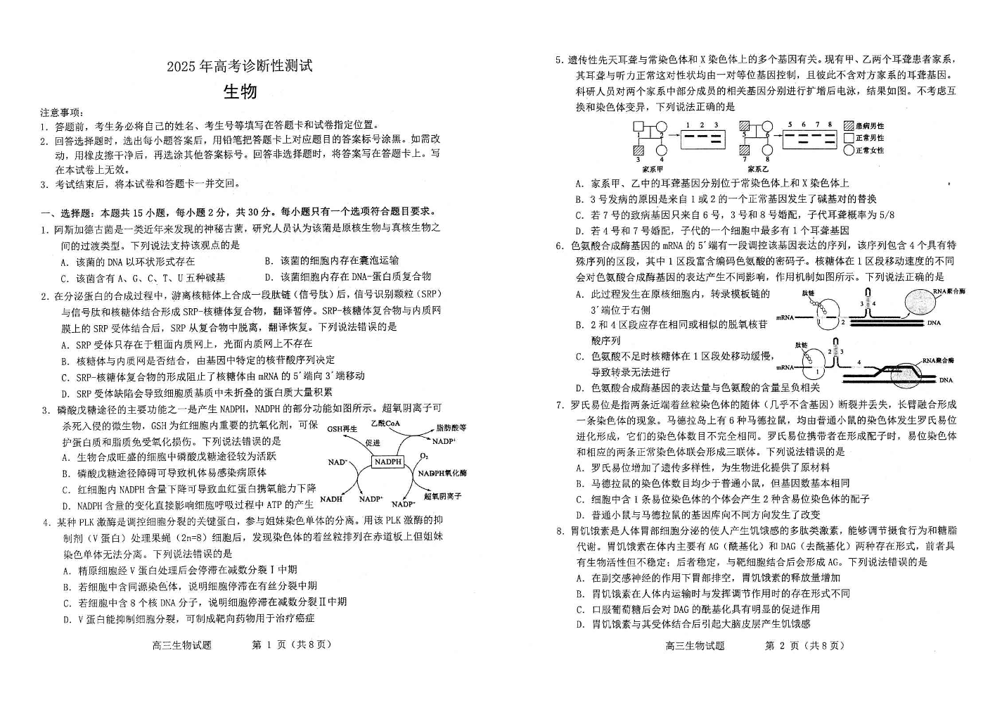 山东省烟台市2024-2025学年下学期3月高三诊断性测试(一模)生物