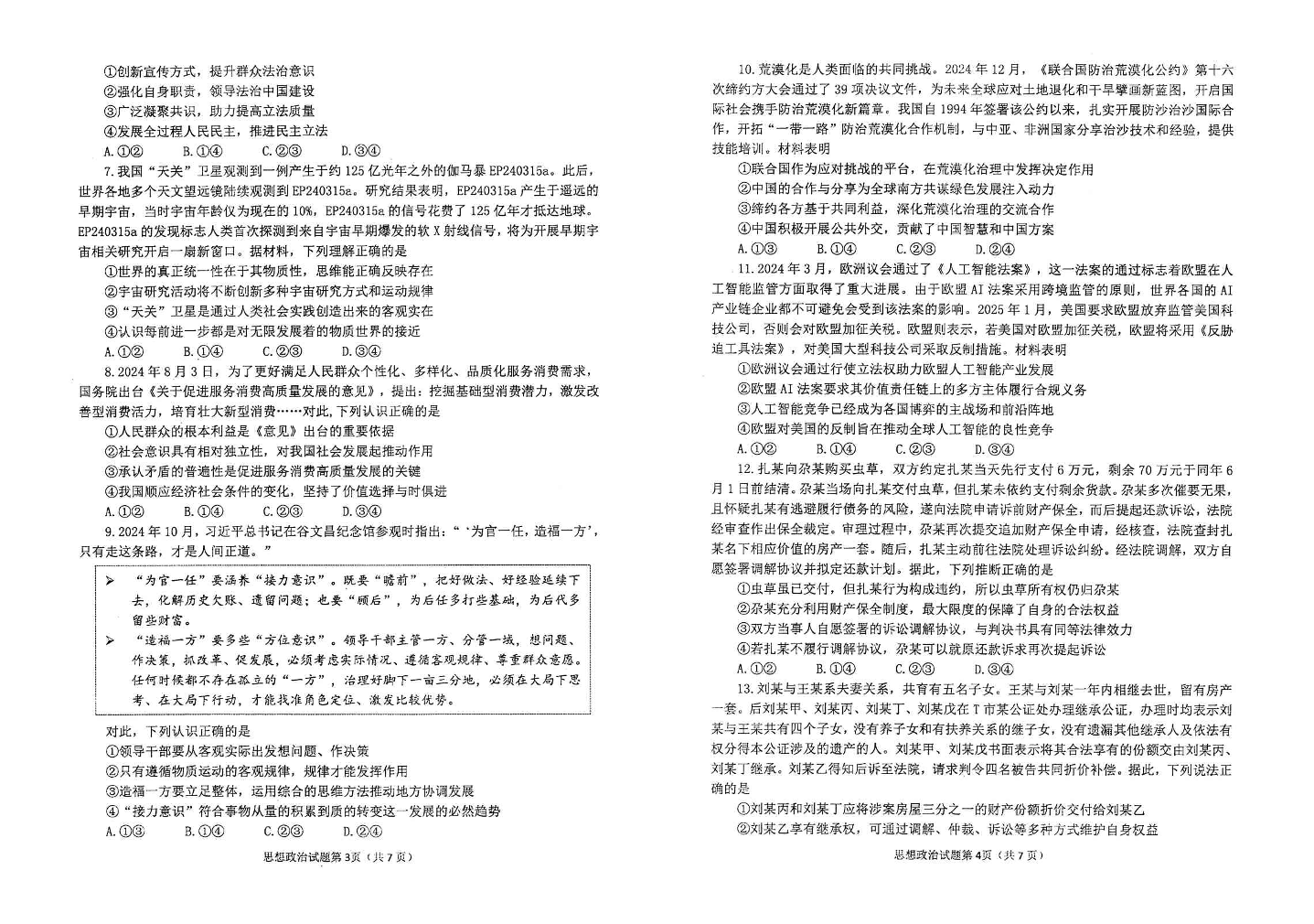山东省烟台市2024-2025学年下学期3月高三诊断性测试(一模)政治