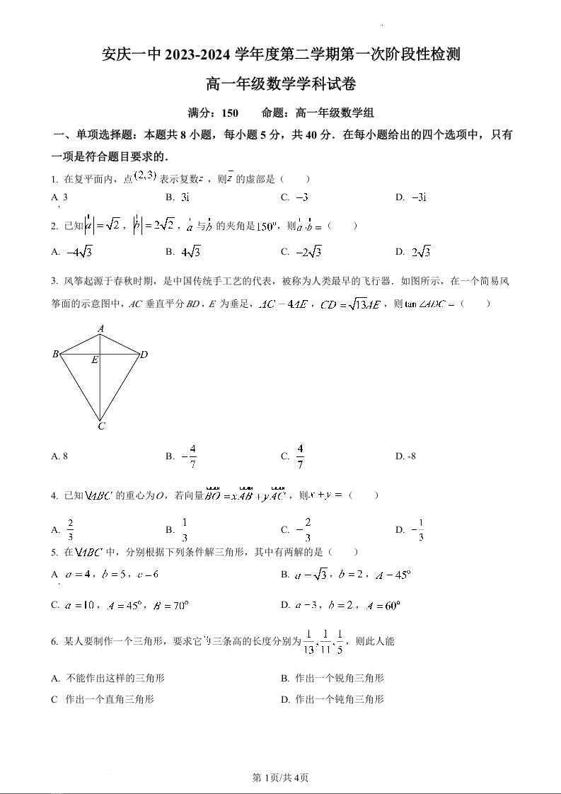 安徽省安庆市第一中学2023-2024学年高一下学期第一次阶段检测数学(原卷版)