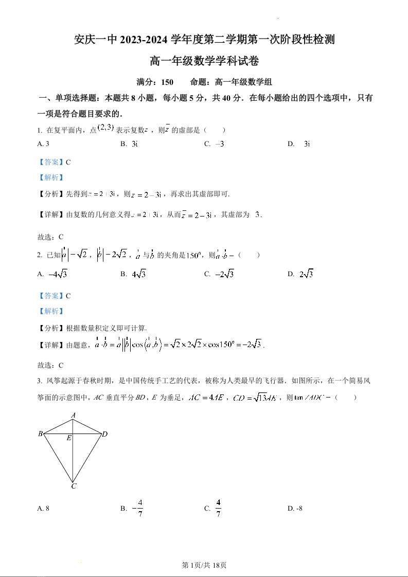 安徽省安庆市第一中学2023-2024学年高一下学期第一次阶段检测数学(精品解析版)