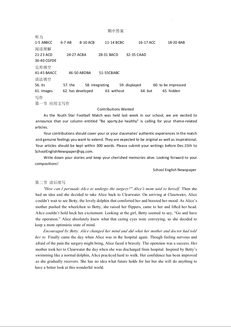 安徽省安庆市第一中学2023-2024学年高一下学期第一次阶段检测英语答案