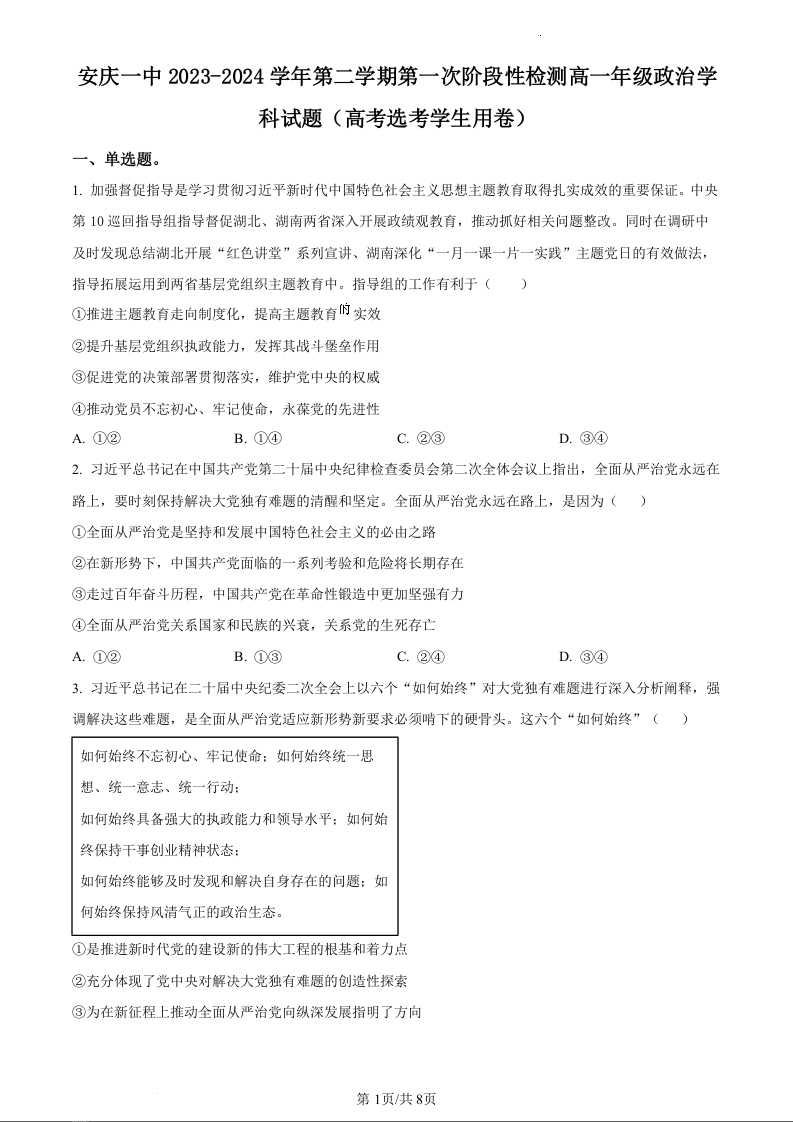 安徽省安庆市第一中学2023-2024学年高一下学期第一次阶段检测政治(原卷版)