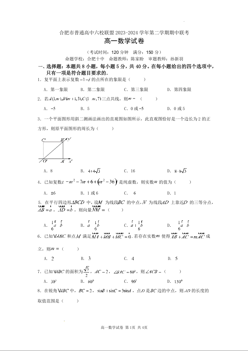 安徽省合肥市普通高中六校联盟2023-2024学年高一下学期4月期中联考数学