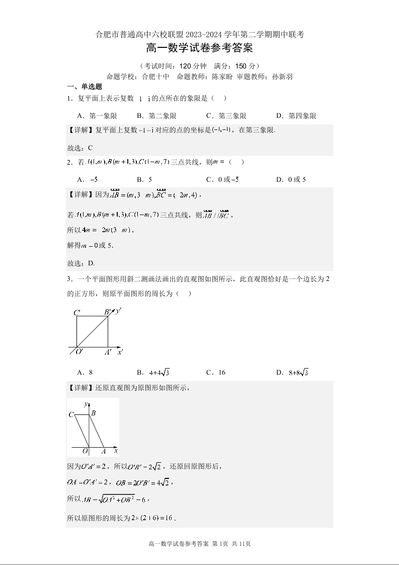 安徽省合肥市普通高中六校联盟2023-2024学年高一下学期4月期中联考数学答案