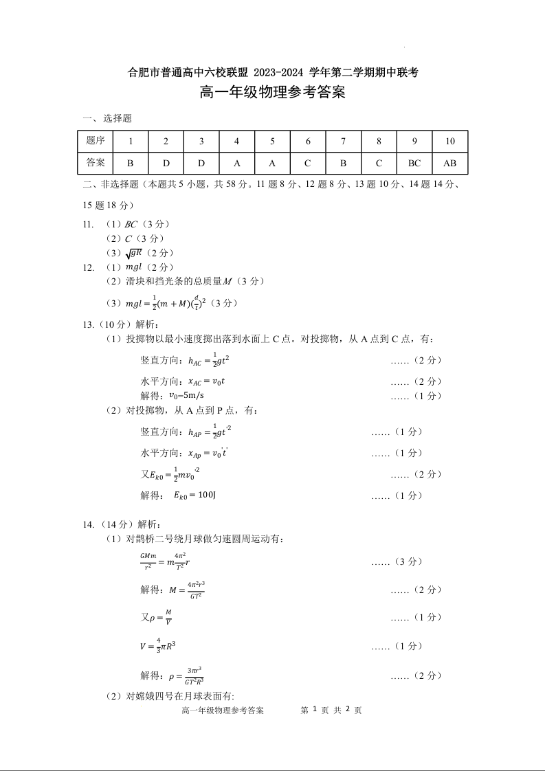 安徽省合肥市普通高中六校联盟2023-2024学年高一下学期4月期中联考物理答案