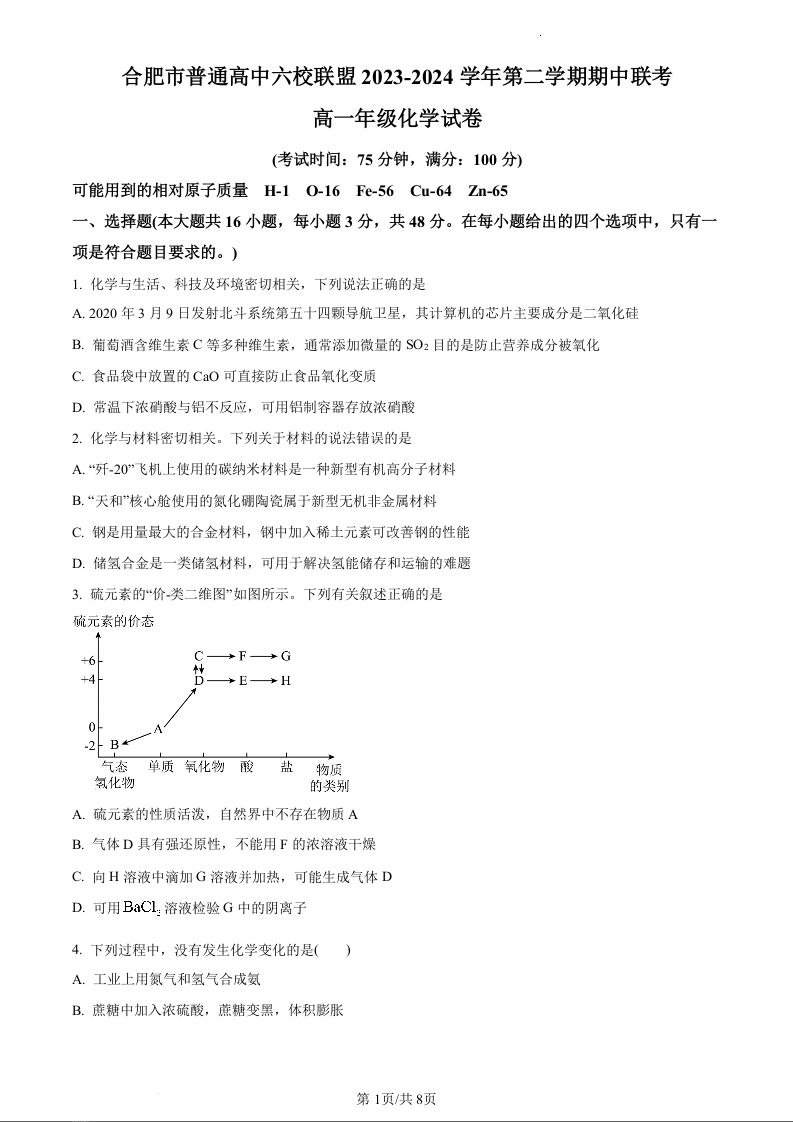 安徽省合肥市普通高中六校联盟2023-2024学年高一下学期4月期中联考化学(原卷版)