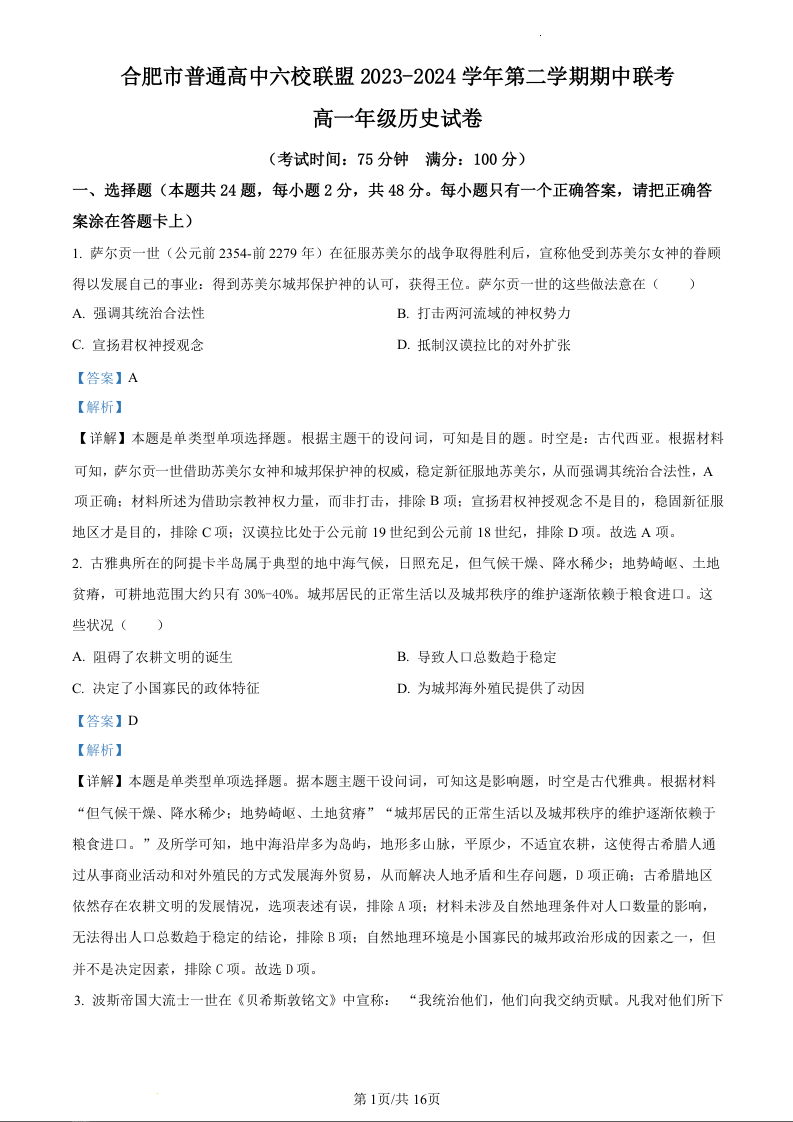 安徽省合肥市普通高中六校联盟2023-2024学年高一下学期4月期中联考历史(精品解析版)