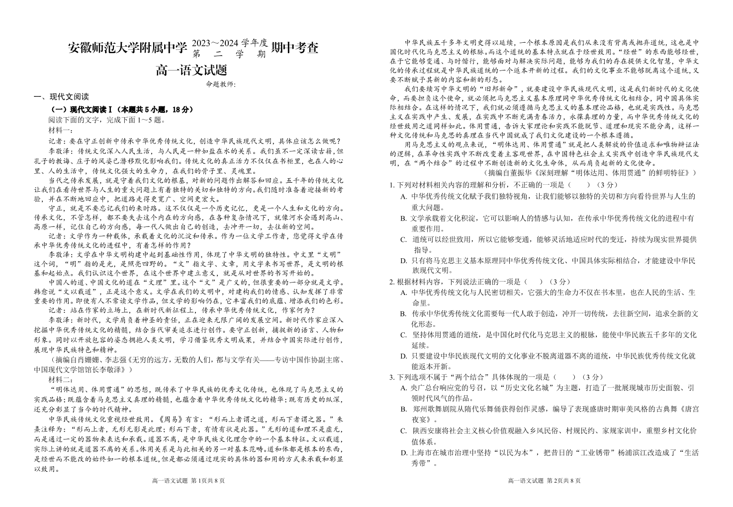 安徽省安徽师范大学附属中学2023-2024学年高一下学期4月期中考试语文