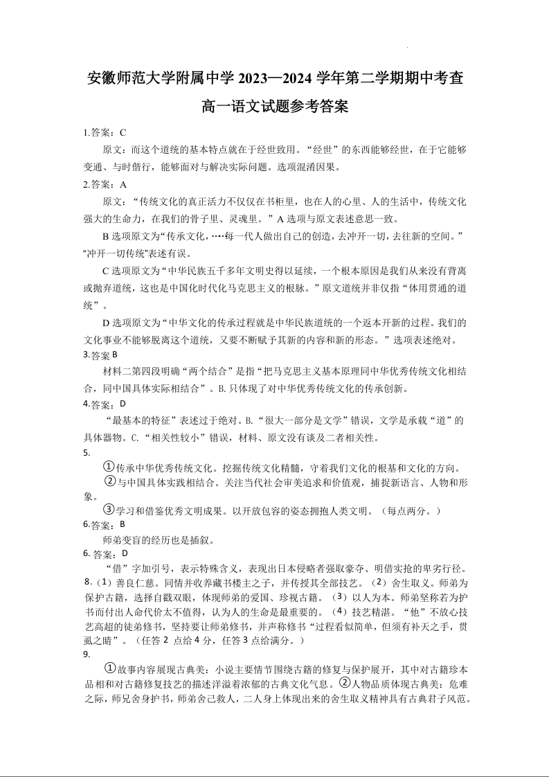 安徽省安徽师范大学附属中学2023-2024学年高一下学期4月期中考试语文答案