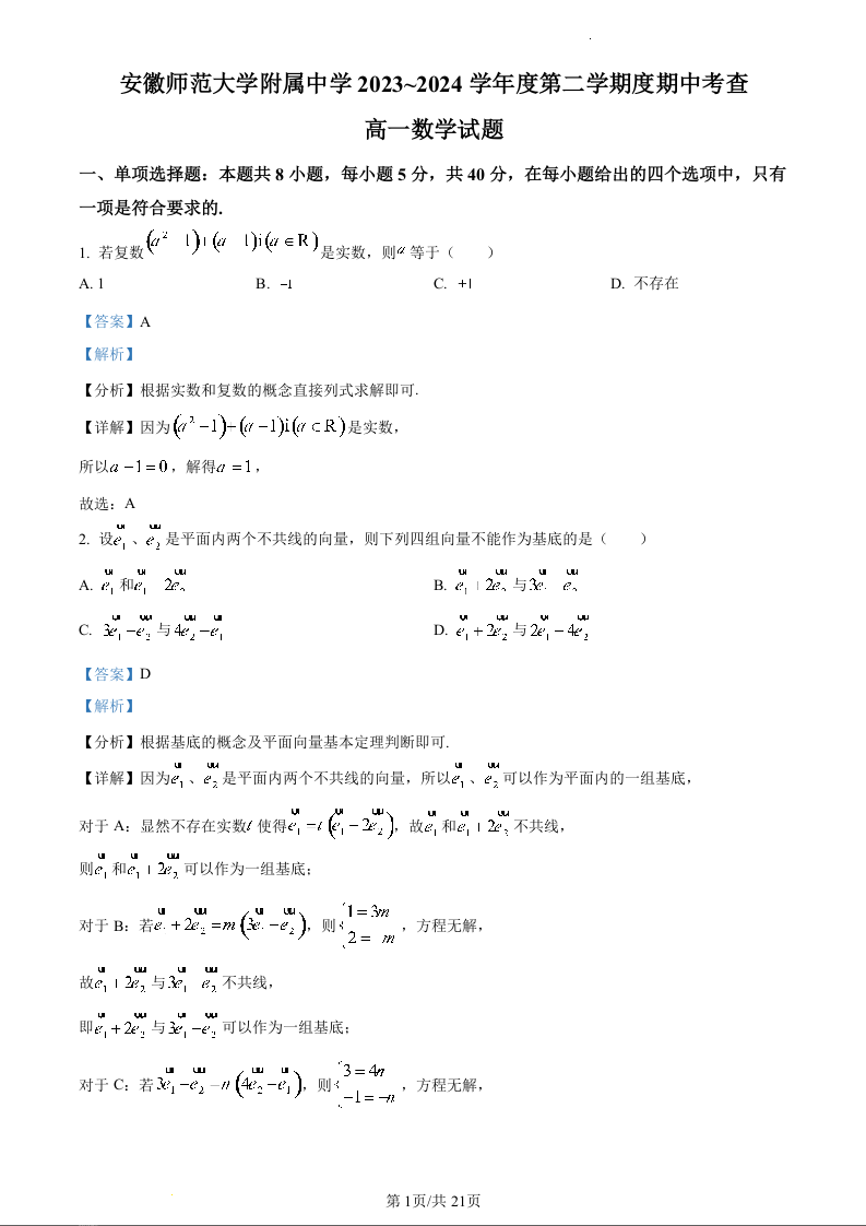 安徽省安徽师范大学附属中学2023-2024学年高一下学期4月期中考试数学(精品解析版)