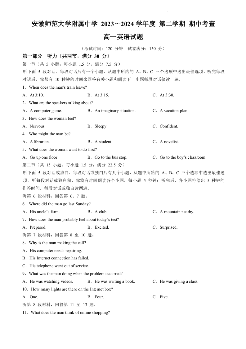 安徽省安徽师范大学附属中学2023-2024学年高一下学期4月期中考试英语+答案