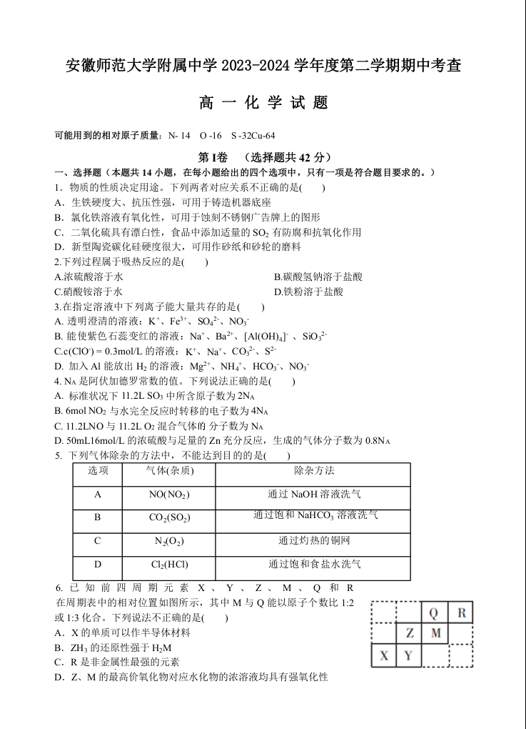 安徽省安徽师范大学附属中学2023-2024学年高一下学期4月期中考试化学
