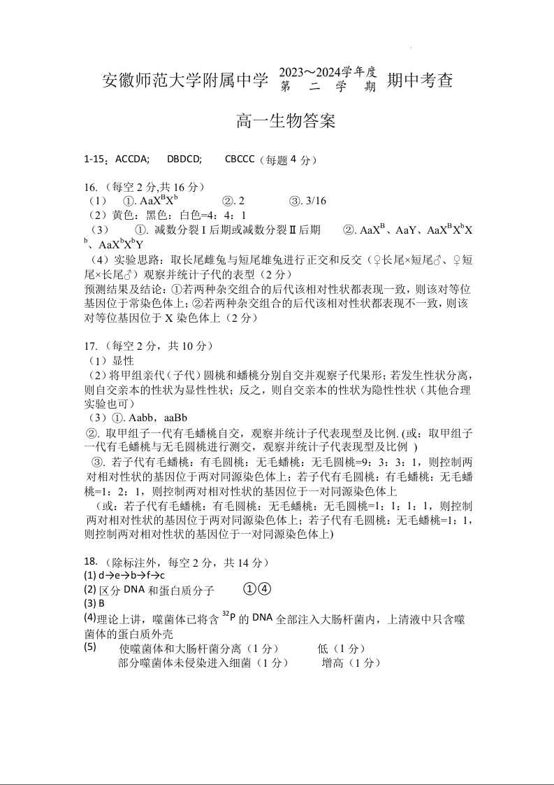 安徽省安徽师范大学附属中学2023-2024学年高一下学期4月期中考试生物答案