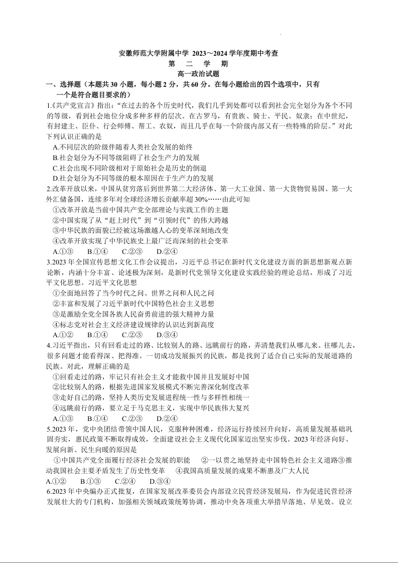 安徽省安徽师范大学附属中学2023-2024学年高一下学期4月期中考试政治