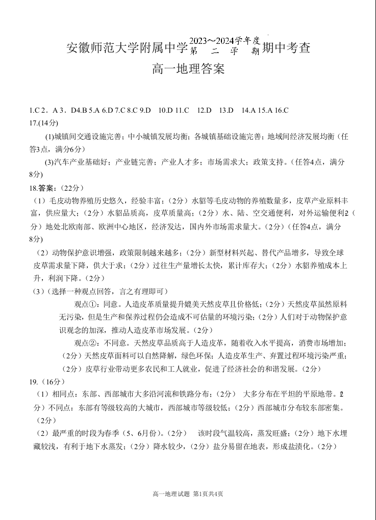 安徽省安徽师范大学附属中学2023-2024学年高一下学期4月期中考试地理答案